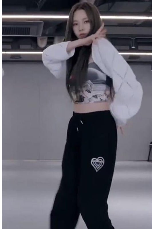 Aespa Karina Heart Dance Practice Joggers Sweatpants Merchandise! The shirt is 100% cotton. Super comfy and skin-friendly. Match with your bias!
