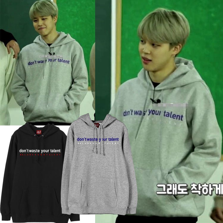 BTS Park Jimin Don’t Waste Your Talent Balance and Talent Hoodie Sweatshirt! The sweatshirt is 100% cotton with a velvet soft interior. Super comfy and skin-friendly. Match with your bias!